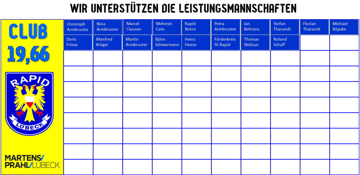 Mit einer Mitgliedschaft im CLUB 1966 unterstützen Sie die Leistungsmannschaften des SC Rapid Lübeck e.V. Durch Ihre Spende sollen direkt alle Leistungsmannschaften und deren Umfeld gefördert werden. Es geht im CLUB 1966 darum, möglichst viele Förderer zusammenzubringen und für den Fußball beim SCR zu begeistern!